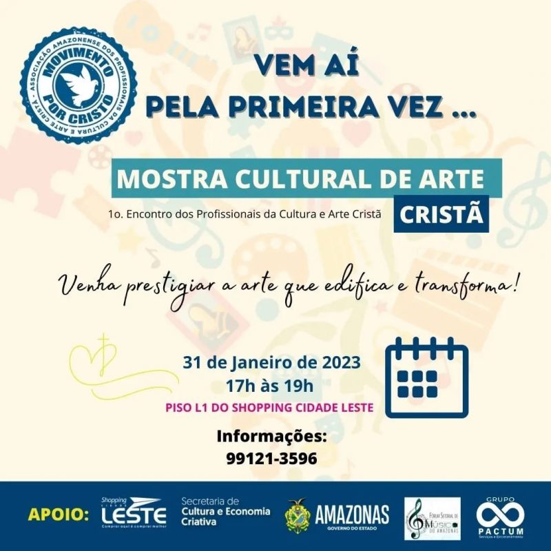 Com duas atividades, o “Primeiro Encontro dos Profissionais da Cultura e Arte Cristã” acontecerá no próximo dia 31 (terça-feira), das 14h às 19h, no shopping Cidade Leste, localizado na avenida Autaz Mirim, 282, Tancredo Neves, zona Leste de Manaus.