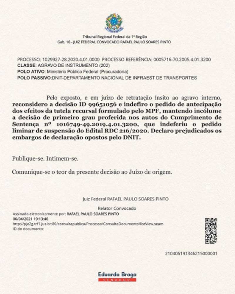 Na ocasião, o Ministério da Infraestrutura, por meio do Departamento Nacional de Infraestrutura de Transportes (Dnit), informou que apresentaria um recurso. Além disso, a pasta já preparava outro instrumento jurídico para recorrer junto ao Superior Tribunal de Justiça (STJ), disse o ministro Tarcísio de Freitas em videoconferência com o senador Eduardo em 26 de março.