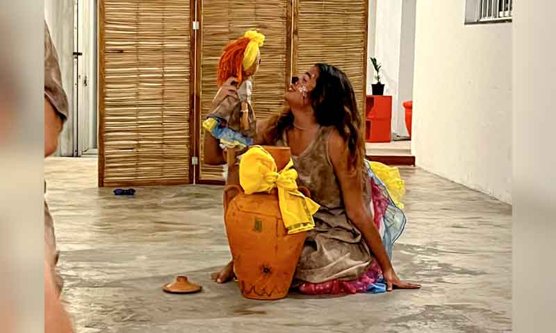Misturando a palhaçaria com música ao vivo e elementos da cultura de terreiro, o espetáculo constrói uma experiência sensorial. As rezas, os santos e o catolicismo preto se cruzam com a presença das pretas-velhas, trazendo a espiritualidade como um ponto de encontro e reconhecimento entre o palco e a plateia.