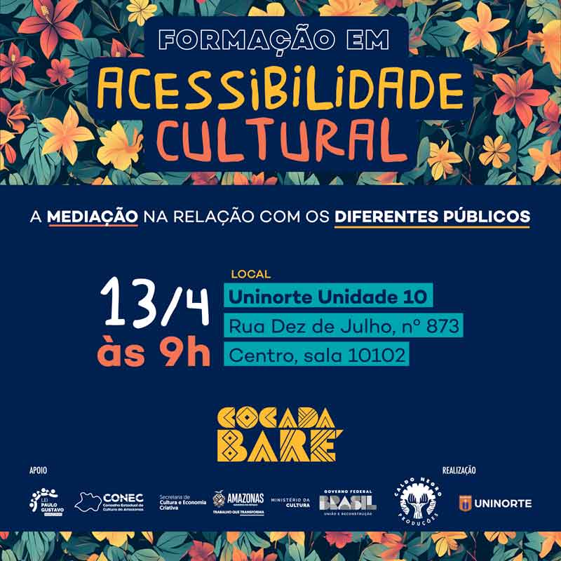 Acontece no dia 13 de abril, de forma gratuita, a formação Acessibilidade Cultural: A Mediação Cultural na Relação com Diferentes Públicos, realizada pela Caldo Negro Produções e pelo grupo Cocada Baré em parceria com o Grupo Do Quilombo se Fez Samba Raiz e a Uninorte. O curso é voltado para gestores, educadores, estudantes e agentes culturais e tem o objetivo de debater medidas de acessibilidade cultural para pessoas com deficiência.