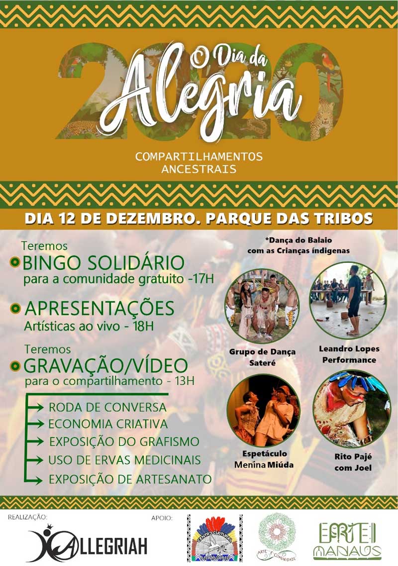 O grupo “Allegriah” realizará nos próximos dias 12 e 14, a 6ª edição do “Dia da Alegria”, com o tema: “Compartilhamentos Ancestrais”, em dois bairros de Manaus: dia 12, às 13h, no Centro Cultural Mainuma,no bairro indígena Parque das Tribos; e no dia 14 de dezembro, às 14h, na base do Allegriah, na rua 27 de Novembro. As atividades tem o objetivo de proporcionar o acesso à cultura, arte e ações sociais.Segundo a coordenadora do Allegriah, a atriz e produtora cultural, formanda do curso de Artes Cênicas da UEA, Jackeline Monteiro, tudo será feito seguindo os protocolos de segurança estabelecidos pela Organização Mundial da Saúde (OMS)