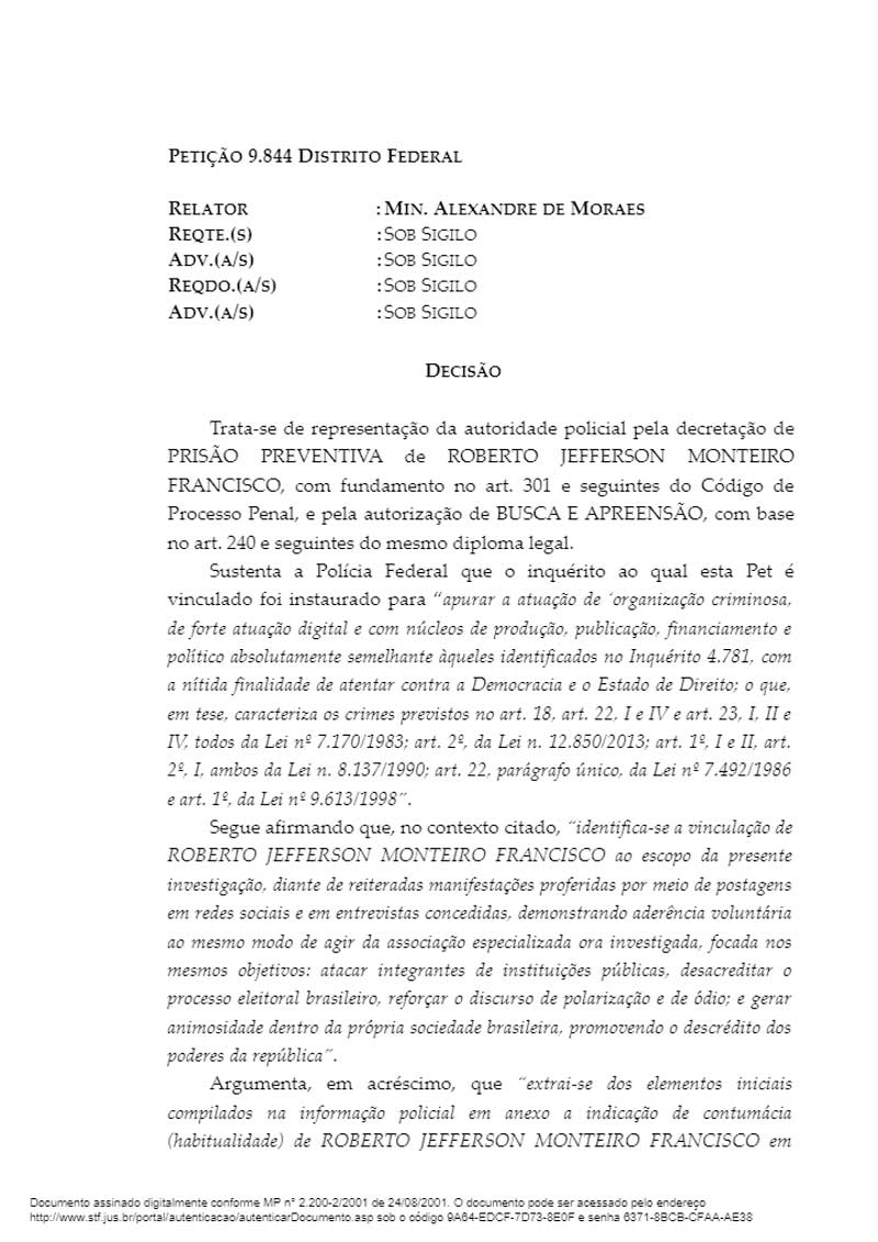 O ministro Alexandre de Moraes, do Supremo Tribunal Federal, determinou a prisão preventiva do ex-deputado Roberto Jefferson (PTB-RJ) e o cumprimento de busca e apreensão contra ele por participação em uma organização criminosa digital montada para ataques à democracia.