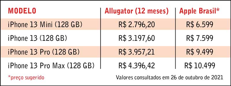 A nível de comparação, no Allugator, o iPhone 13 Pro Max de 128 GB pode ser alugado por R$ 4.396,42 à vista ou R$ 498,26 ao ser parcelado em doze vezes com juros no plano anual. No site da Apple Brasil, o mesmo smartphone aparece no catálogo por R$ 10.499 com a mesma quantidade de armazenamento.
