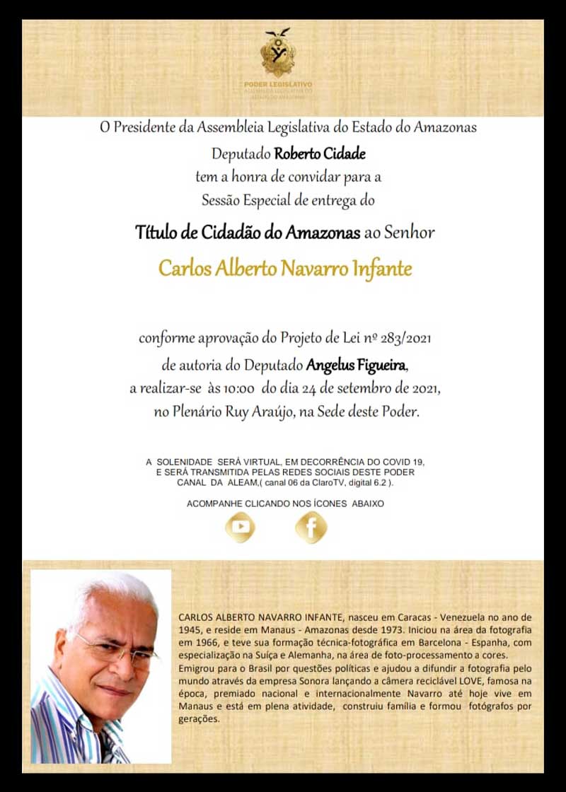 Responsável por instalar o primeiro laboratório fotográfico para revelação em cores no Norte do Brasil, o venezuelano Carlos Navarro Infante, 76, será condecorado cidadão amazonense, nesta sexta-feira (24), às 10h, no Plenário Ruy Araújo da Assembleia Legislativa do Amazonas (Aleam). A concessão do título é inédita na vida pública do deputado estadual Angelus Figueira (DC), 71, autor da homenagem.