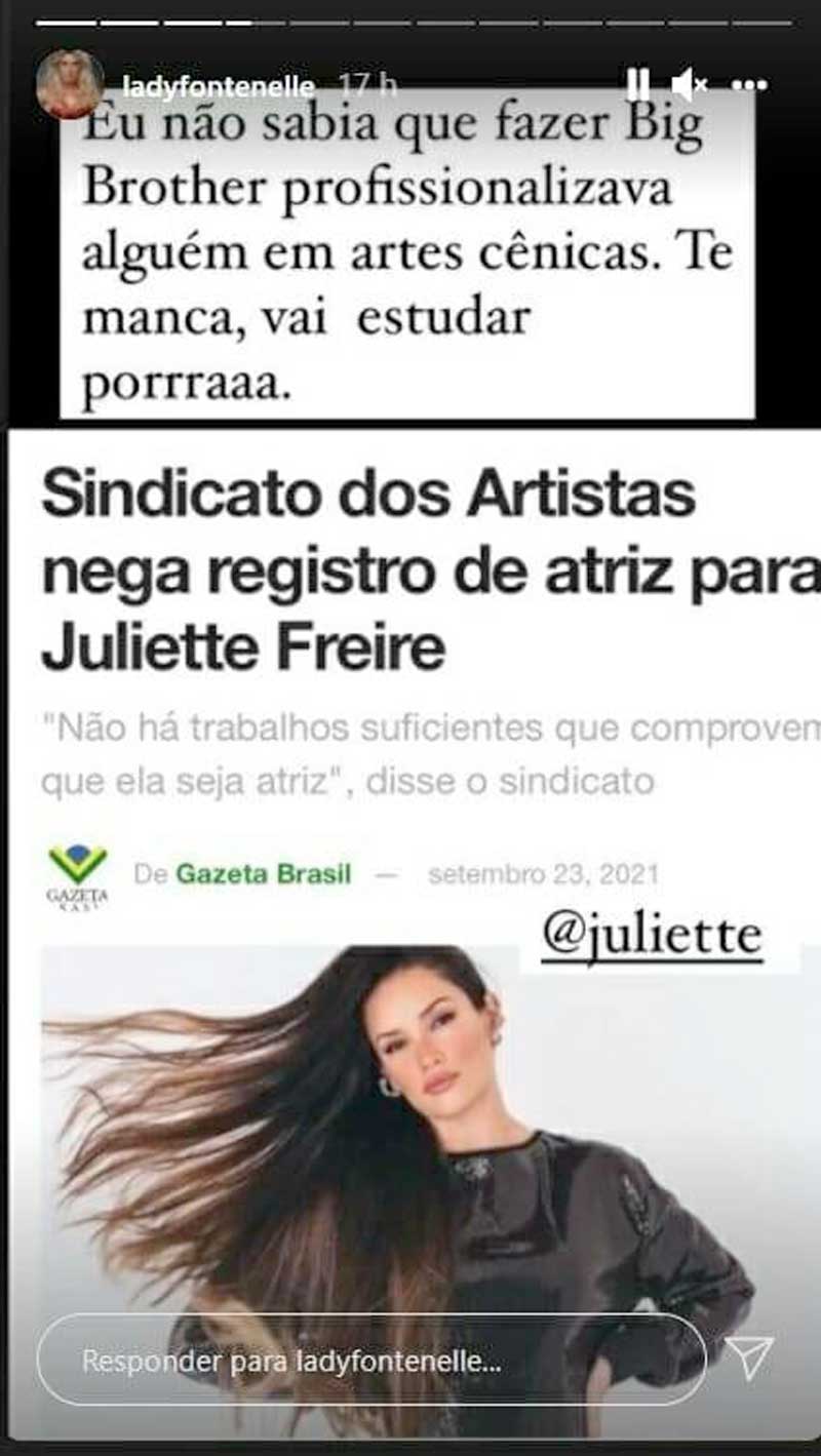 Com muito tempo livre, Antonia Fontenelle resolveu se manifestar em torno da notícia de que Juliette foi barrada ao tentar o registro de atriz no Sindicado dos Atores, mas a instituição negou em virtude da falta de trabalhos suficientes.