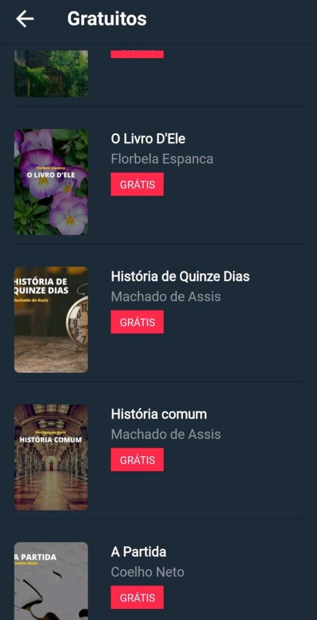 Para encontrar os livros gratuitos, basta acessar o menu “Explorar”, depois tocar em “Explorar por Categorias” e, por fim, rolar a tela até encontrar a seção “Gratuitos”. Lá estão  obras de diversos temas e autores e autoras brasileiros e estrangeiros, como Bernardo Guimarães, Oscar Wilde, Machado de Assis, Florbela Espanca e Castro Alves.
