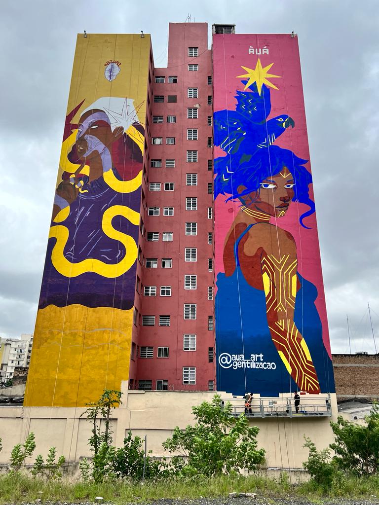 Indígena, manauara, artista visual, grafiteira, Auá Mendes, residente em São Paulo, é destaque na avenida Bixiga, no centro da capital paulista. Com mais de 30 metros, o grafite intitulado “Ãgawara-itá Mukatúru: As encantadas protegem”, é uma produção carregada de atravessamentos, que busca fortalecer a sua própria existência, assim como de seu povo, seus ancestrais vivos e aqueles que encantaram.