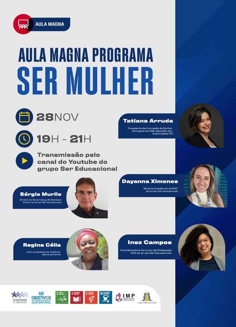No dia 28 de novembro, das 19h às 21h, o grupo Ser Educacional, mantenedor da UNINASSAU, UNAMA e UNINORTE, realiza uma aula magna sobre o projeto Ser Mulher, que oferta bolsas de graduação 100% gratuitas para mulheres vítimas de violência doméstica. Ela é transmitida por meio do canal do Ser Educacional no YouTube.