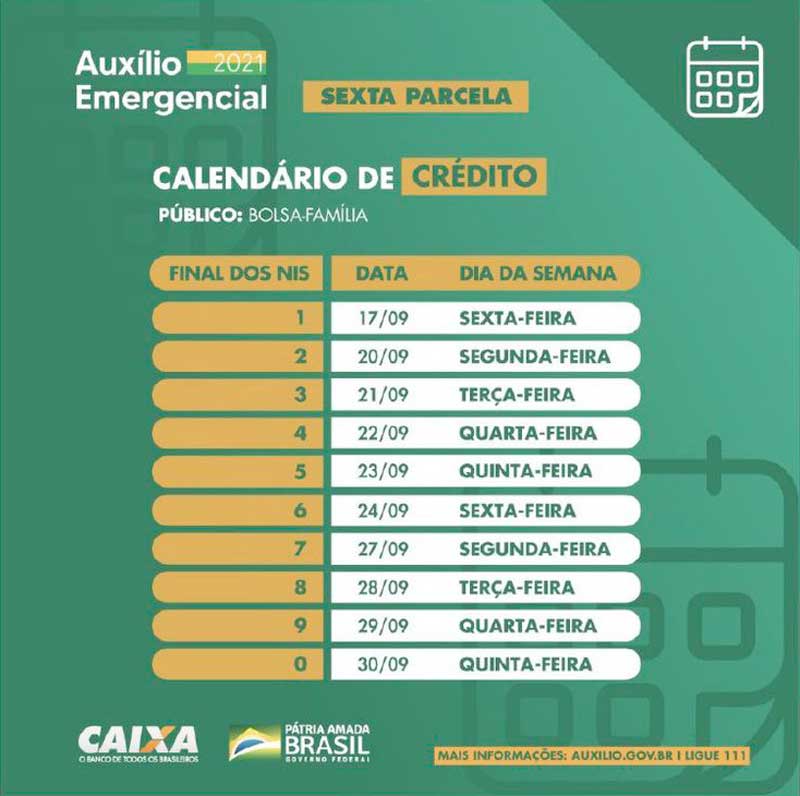 O programa se encerraria com a quarta parcela, depositada em julho e sacada em agosto, mas foi prorrogado até outubro, com os mesmos valores para o benefício. A Agência Brasil elaborou um guia de perguntas e respostas sobre o pagamento do auxílio em 2021.