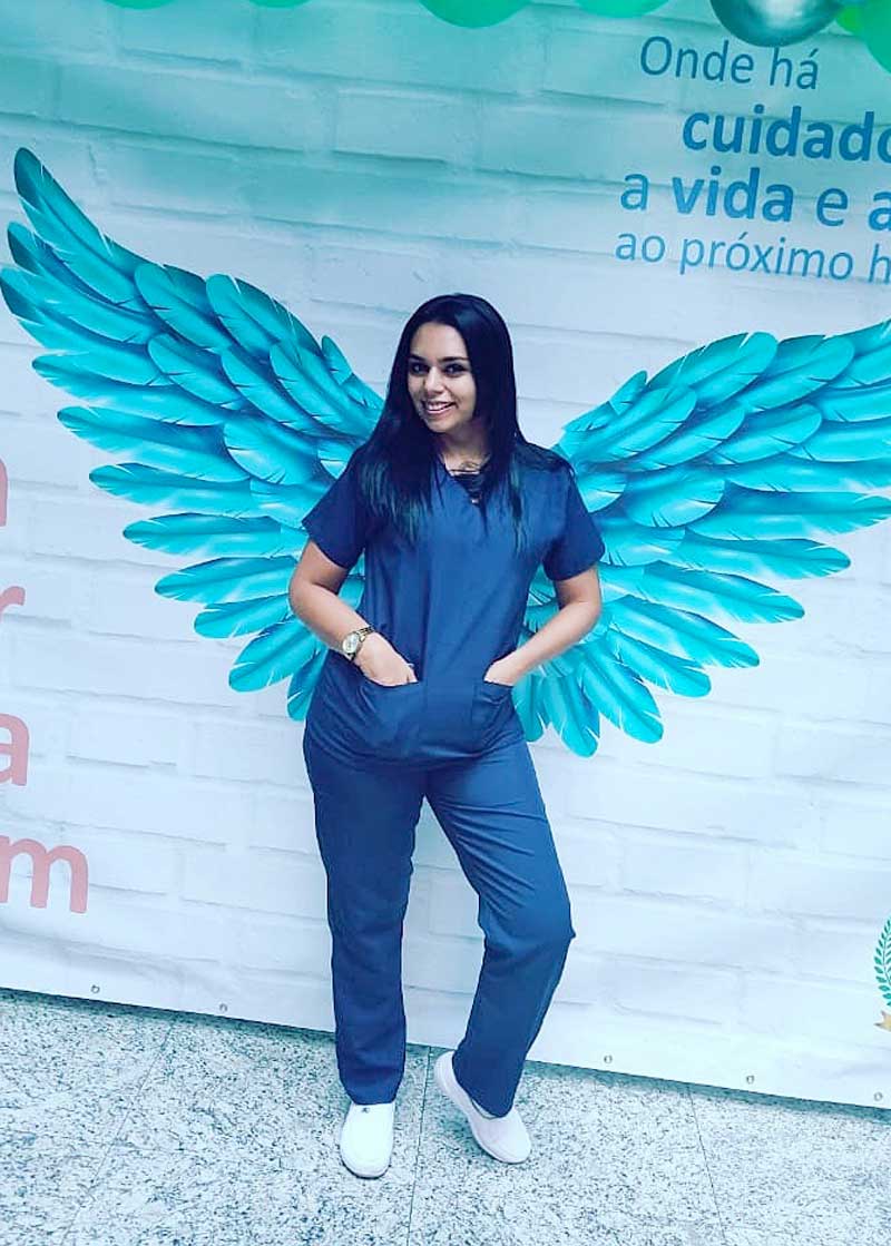 A egressa do Literatus conta que quando começou a estudar enfermagem o foco era atuar no atendimento de idosos, porém no decorrer do estágio foi se identificando com a assistência hospitalar e curativos, e se tornaram sua grande paixão.