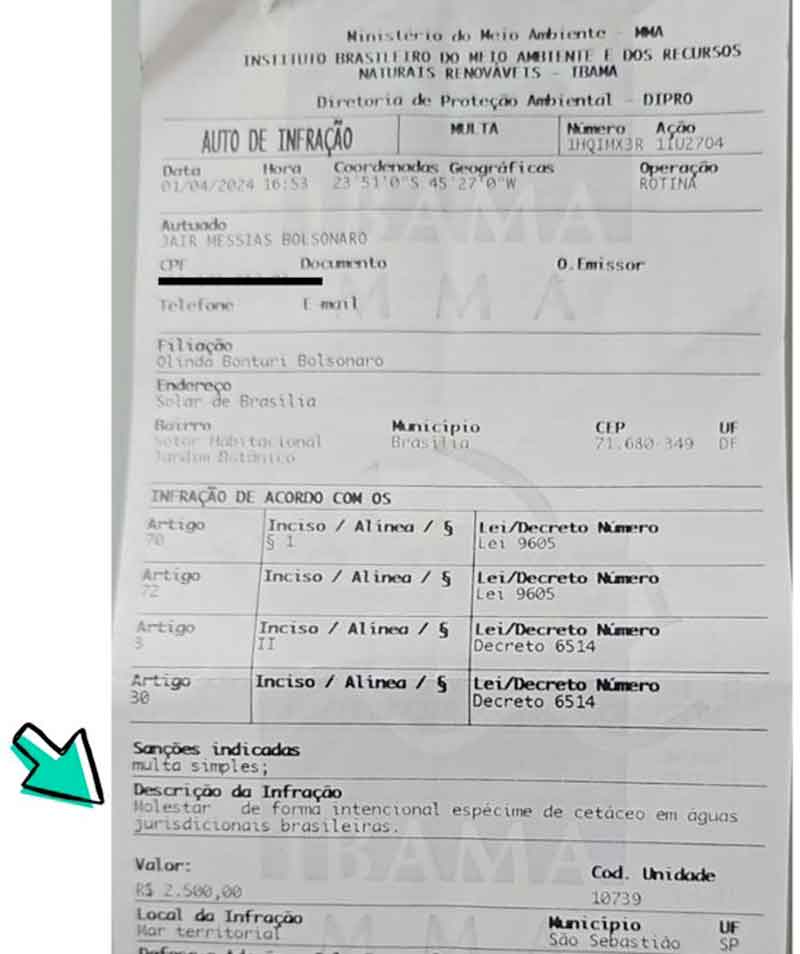 O ex-presidente Jair Bolsonaro (PL) recebeu uma multa de R$ 2,5 mil do Instituto Brasileiro do Meio Ambiente e dos Recursos Naturais Renováveis (Ibama) por ter, supostamente, importunado uma baleia durante um passeio de jet ski em São Sebastião, no litoral norte de São Paulo. O caso ocorreu em 2023.