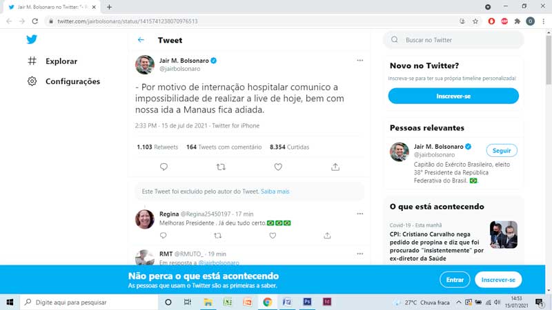– Por motivo de internação hospitalar comunico a impossibilidade de realizar a live de hoje, bem com nossa ida a Manaus fica adiada.