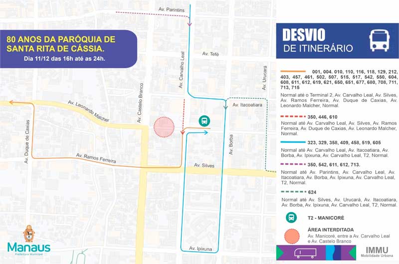 A Prefeitura de Manaus, por meio do Instituto Municipal de Mobilidade Urbana (IMMU), vai alterar o trânsito e o itinerário de 47 linhas de ônibus para a realização dos festejos de 80 anos da paróquia de Santa Rita de Cássia, no bairro Cachoeirinha, zona Sul, neste sábado, 10/12, das 15h às 0h.