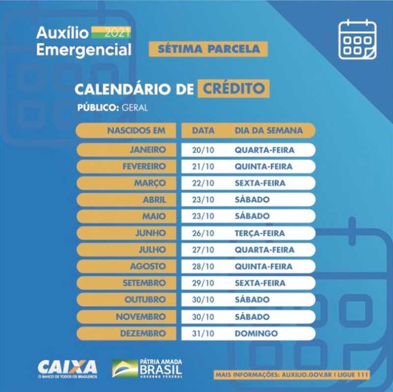 Também hoje, recebem a sétima parcela do auxílio emergencial os participantes do Bolsa Família com Número de Inscrição Social (NIS) de final 5. As datas da prorrogação do benefício foram anunciadas em agosto.