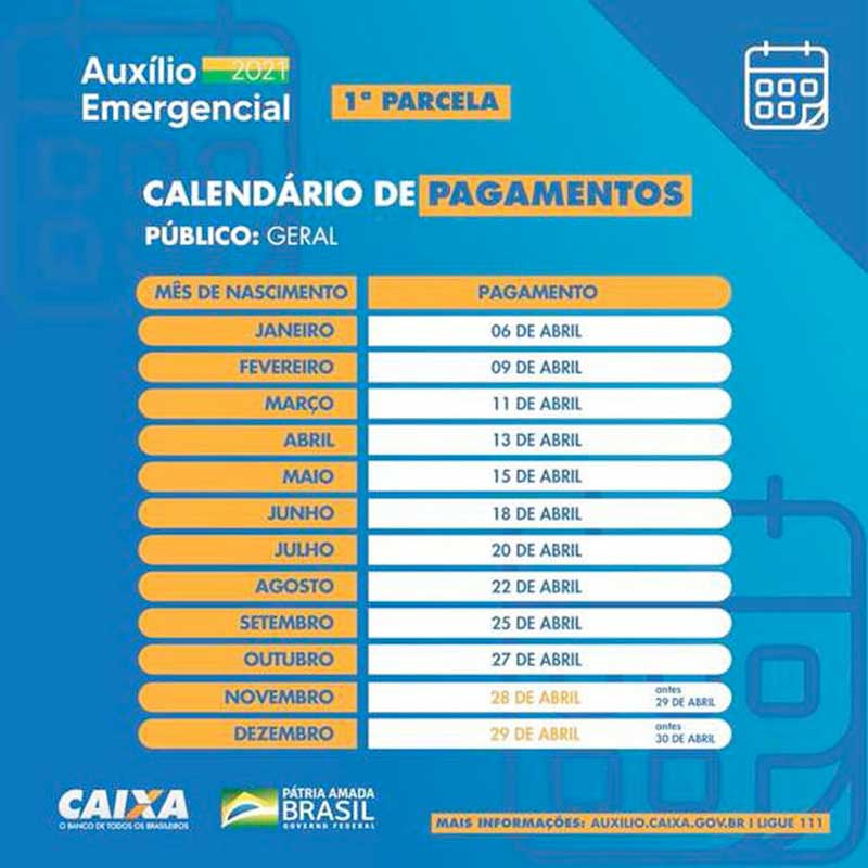 A primeira parcela da nova rodada do auxílio emergencial começou a ser depositada nas contas poupança digitais no último dia 6 e vai até o dia 29, para trabalhadores autônomos e inscritos no Cadastro Único de Programas Sociais do Governo Federal (CadÚnico). Cerca de 10 milhões de beneficiários do Bolsa Família seguem um calendário distinto de saque, nos dez últimos dias úteis de cada mês, e podem sacar o benefício ou transferi-lo para uma conta-corrente imediatamente.