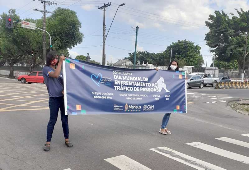 As ações da Prefeitura de Manaus alusivas ao Dia Mundial de Enfrentamento ao Tráfico de Pessoas – campanha Coração Azul, celebrado nesta sexta-feira, 30/7, foram realizadas em diversos pontos da cidade. Coordenada pela Secretaria Municipal da Mulher, Assistência Social e Cidadania (Semasc), as atividades envolveram sensibilização de motoristas nas barreiras das rodovias estadual AM-010 (Manaus-Itacoatiara) e federal BR-174 (Manaus – Boa Vista), posto da Polícia Rodoviária Federal, praça São Sebastião, Teatro Amazonas e Palácio da Justiça, os últimos três espaços localizados no Centro.