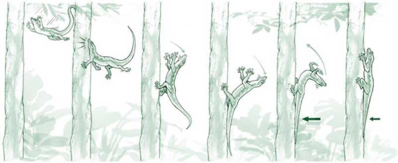 O Dr. Full, que também foi co-autor do artigo sobre a lagartixa correndo sobre a água, se reuniu a um time de pesquisadores com os quais já trabalho antes em publicações, como Ardian Jusufi e Rob Siddall, do Instituto Max Planck, e constataram que os espécimes batem primeiro a cabeça nos troncos, e depois envergam o corpo para trás, quase a 100 graus, contando com a cauda e as patas traseiras para estabilizar o “impacto controlado”, o que foi chamado de “resposta anti-queda” (Fall Arresting Response, ou FAR).