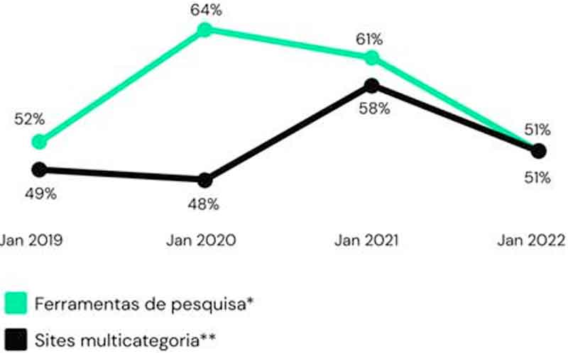 Além disso, o volume de pesquisas diretamente dentro dos varejos se equiparou ao volume em mecanismos de buscas (Insider Intelligence). E essas buscas dentro dos varejos não são apenas específicas: um dado do Mercado Livre mostra que 8 em cada 10 buscas são por termos genéricos, ou seja, sem nenhuma marca atrelada.