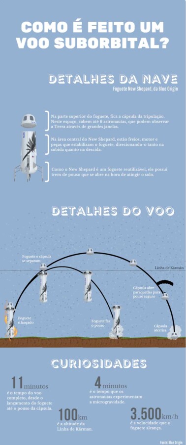 “O voo suborbital segue uma trajetória balística, atingindo seu ponto mais alto acima do que consideramos a fronteira do espaço, a Linha de Kármán, a 100 quilômetros de altitude, onde aeronaves convencionais não conseguem voar, e voltando à superfície em queda livre”, explica Wandeclayt Melo, físico e membro do Céu Profundo, projeto de divulgação e educação científica com foco em astronomia e exploração espacial.