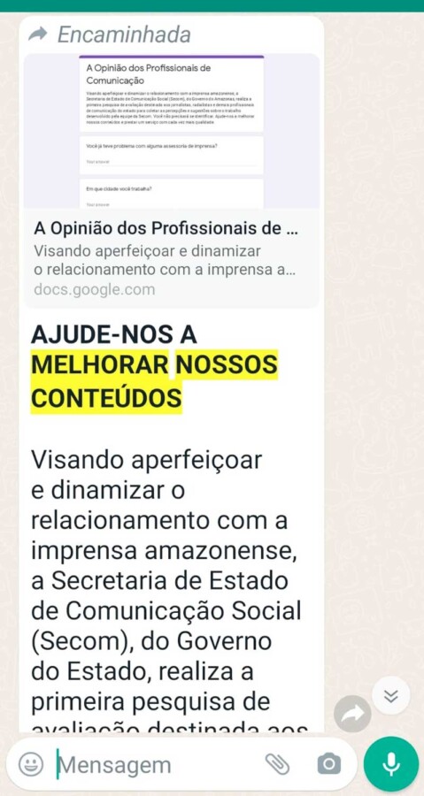 Veja a mensagem pueril que a Comunicação de Wilson Lima enviou nos grupos de WhatsApp dos jornalistas: