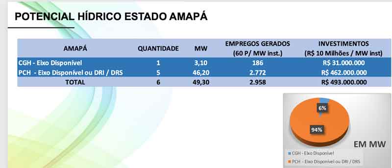 Conforme informações da ANEEL, o Amapá tem capacidade para instalar 5 PCHS e uma CGH, o que poderia resultar na criação de 2.958 postos de trabalho e investimentos de R$500 milhões.