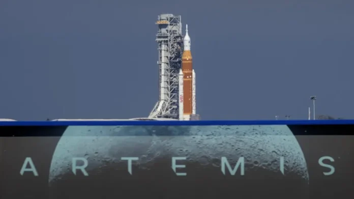 O céu parcialmente aberto e a temperatura agradável em Cabo Canaveral oferecem o cenário ideal para que o gigantesco foguete “Space Launch System” (SLS) mostre sua potência.