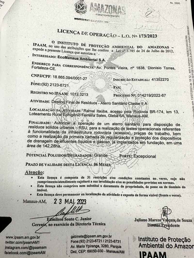 O Instituto de Proteção Ambiental do Amazonas (Ipaam) concedeu no dia 23 de maio deste ano, a Licença de Operação Nº 173/2023 para a empresa operar “um aterro sanitário de resíduos sólidos (RSU), para a realização de testes operacionais referentes à funcionalidade da infraestrutura rodoviária (acessos), praças de trabalho, bem como a realização da primeira camada de regularização e proteção dos dispositivos de drenagem de efluentes líquidos e gasoso, já implantados em fundação, em uma área de 142,28ha”.