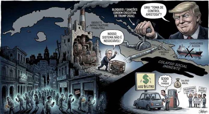 No dia 29 de janeiro de 2026, Donald Trump assinou uma ordem executiva impondo sanções a qualquer país que forneça petróleo para a ilha. O presidente Miguel Díaz-Canel confirmou que nenhum carregamento chegou ao território nos últimos três meses. O impacto financeiro é devastador com o preço do combustível no mercado paralelo atingindo US$ 9 por litro. Encher um tanque de carro pode custar mais de US$ 300, valor que supera o salário anual da maior parte da população.