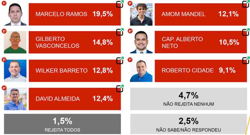 A pesquisa Ipen também avaliou a rejeição dos candidatos junto ao eleitorado, colocando o candidato Marcelo Ramos como o mais rejeitado em Manaus, com 19,5%, seguido por Gilberto Vasconcelos com 14,8% e Wilker Barreto com 12,8%.