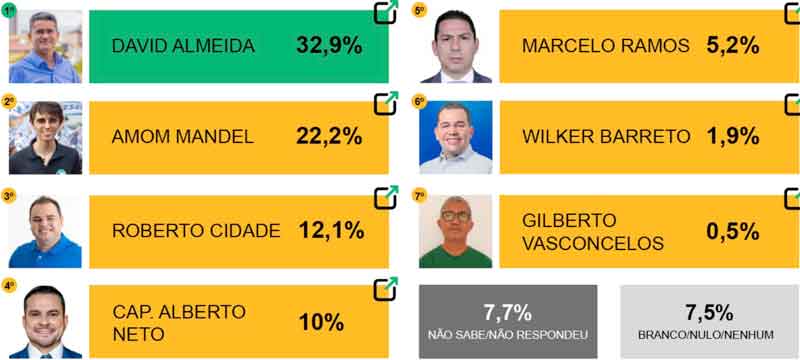 Já numa possível disputa entre David Almeida e Roberto Cidade, a vitória de David alcançaria um percentual ainda maior: 51,1% contra 27,7%.