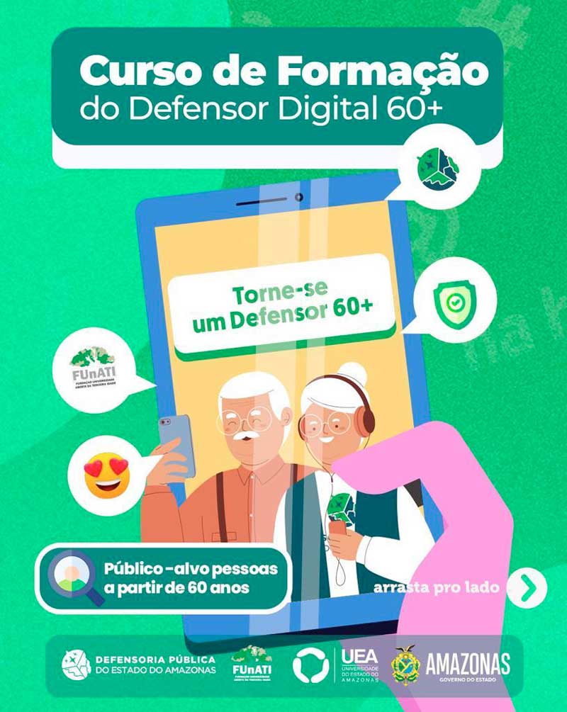 A Defensoria Pública do Estado do Amazonas (DPE-AM), em parceria com Fundação Universidade Aberta da Terceira Idade (FUnATI), vai promover o curso “Defensor Digital 60+”, voltado às pessoas com mais de 60 anos. A proposta é promover não apenas a cultura digital, mas também a capacitação de idosos para a vivência na Era Digital e torná-los multiplicadores de informações para o enfrentamento dos crimes digitais. O curso é gratuito e terá uma carga horária de 60h.