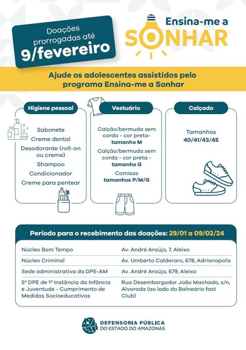 A Defensoria Pública do Estado do Amazonas (DPE-AM), por meio do projeto “Ensina-me a sonhar”, está mobilizando uma campanha para arrecadar itens de higiene pessoal, vestuário e calçados a fim de ajudar adolescentes assistidos pelo programa e que vivem em centro socioeducativos, em Manaus.