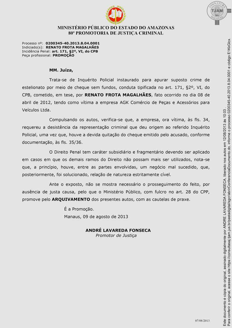 Matérias divulgadas nesta segunda-feira (14/10) acusando o candidato a vice-prefeito Renato Junior (Avante) de ‘suposto estelionato’ esconde propositalmente que o valor foi quitado e ação arquivada há mais de 11 anos, conforme consta em pedido do Ministério Público do Amazonas (MPAM) acatado pela Justiça. ‘Ausência de justa causa’, diz o documento.