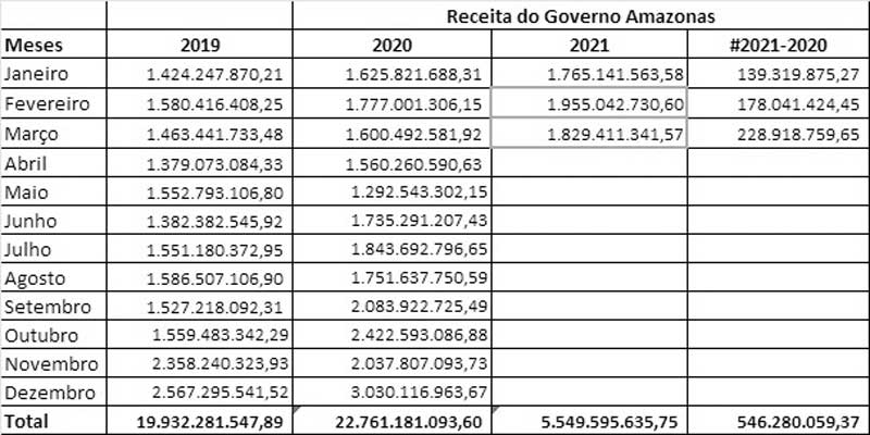 Comparando-se o primeiro trimestre de 2020 com o deste ano, o Governo do Amazonas já recebeu R$ 546.280.059,37 a mais do que o mesmo período do ano passado. Nos três primeiros meses de 2020, o total da receita foi R$ 5.003.315.576,38. No primeiro trimestre de 2021, o valor arrecadado foi de R$ 5.549.595.635,75.