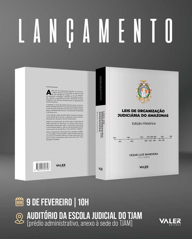 O livro intitulado “Leis de Organização Judiciária do Amazonas”, com organização do desembargador gaúcho Cezar Luiz Bandiera, será lançado nesta quinta-feira (9 de fevereiro de 2023), às 10h, no auditório do prédio administrativo do Tribunal de Justiça do Estado do Amazonas (TJAM), no prédio da Escola Judicial do TJAM.
