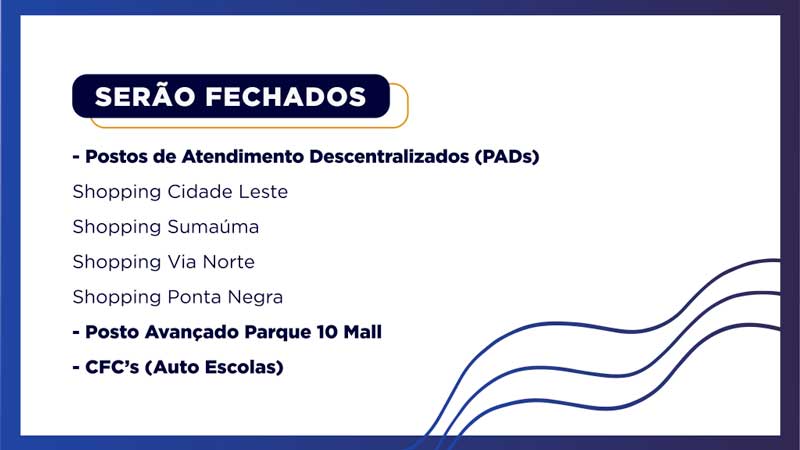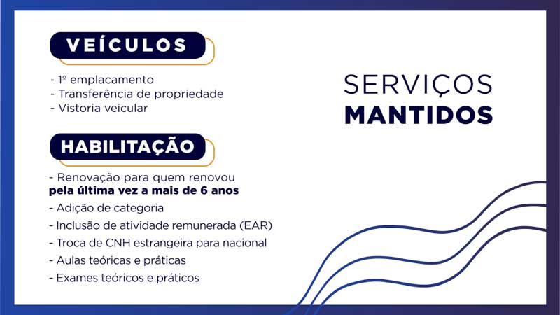 Os demais serviços de veículos e de CNH serão mantidos, inclusive as aulas teóricas e práticas dos Centros de Formação de Condutores (CFCs), havendo apenas uma redução na capacidade de atendimento.