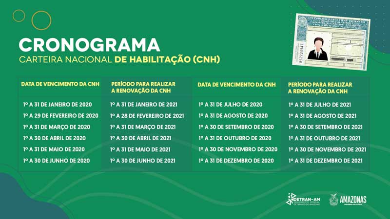 Contudo, é importante lembrar que está em vigor a Resolução 805, do Conselho Nacional de Trânsito (Contran), que estabeleceu novos prazos para a renovação das CNHs vencidas entre 1º de janeiro e 31 de dezembro deste ano. A pessoa cujo documento teve a validade expirada dentro desse prazo tem um calendário de renovação até 31 de dezembro de 2021, conforme cronograma fixado no site do Detran-AM. Ou seja, ela não precisa correr para renovar a habilitação agora, basta realizar agendamento para o período informado pelo Contran.