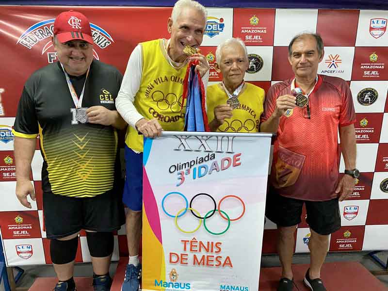 O atleta Francisco Alves, 74, disputa as Olimpíadas há muito tempo no tênis de mesa. Nas primeiras participações, não conseguiu êxito, mas intensificou os treinamentos do programa “Manaus Esportiva” no Núcleo do Coroado, e com o ouro conquistado nesta sexta-feira, chegou a seis medalhas douradas para a conta. Ele também fala do orgulho de ter sobrevivido a um momento tão delicado para a humanidade e ter retornado em grande estilo.