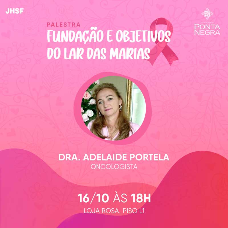 No dia 16, às 18h, a médica oncológica Adelaide Portela, vai realizar uma palestra sobre a Fundação e Objetivos do Lar das Marias, que presta apoio a mulheres com câncer de toda a região Norte do País e até do exterior.