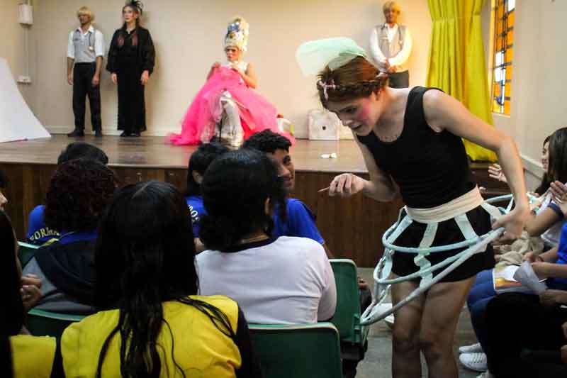 A diretora e atriz Mariellen Kuma também destacou a importância da mediação prévia dos professores, que influenciou diretamente a experiência do público. “Cada escola teve uma dinâmica diferente. A mediação dos professores fez muita diferença para o envolvimento dos alunos. O mais bonito foi ver como as crianças interagiram com os personagens, especialmente com o casal trans Momom e Nestonzinho. Elas torciam por eles e muitas comentaram sobre a identificação com essa história. Foi muito emocionante.”