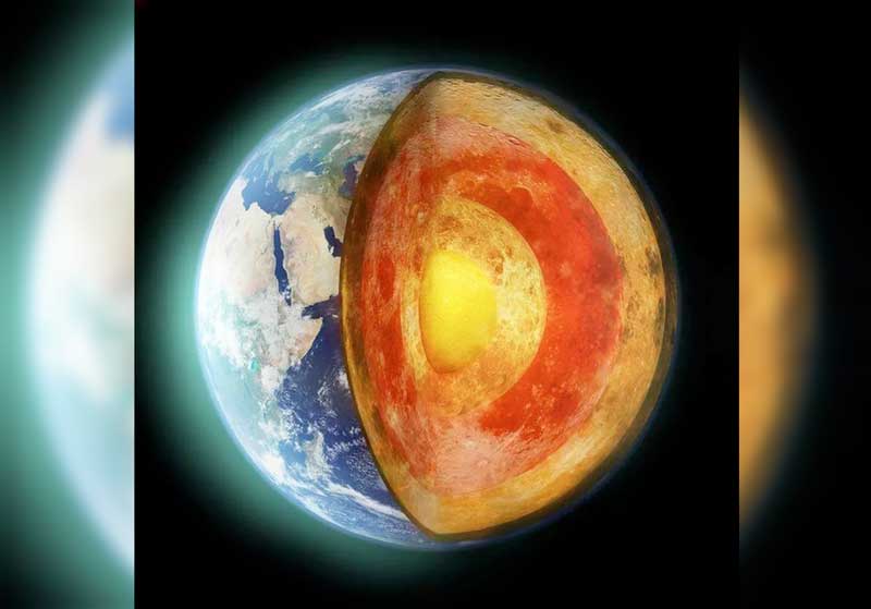 O interior da Terra é formado por camadas parecidas com as de uma cebola. A última delas (a mais profunda) é o núcleo interno sólido de ferro e níquel, que tem um raio de 1.200 km, aproximadamente três quartos do tamanho da Lua.