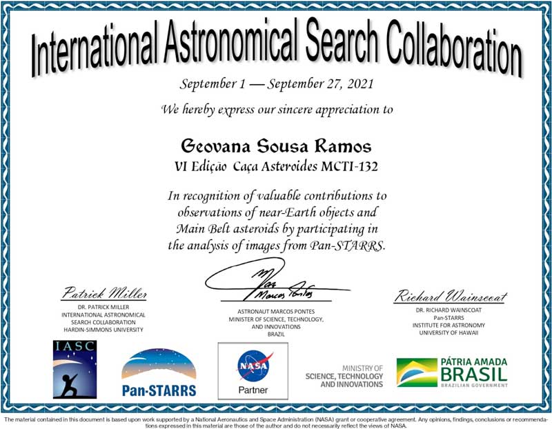Geovana relata que durante a caçada aos corpos celestes, os participantes recebem orientação de uma equipe especializada do MCTI e ainda realizam treinamentos. “São fornecidos vários pacotes de fotos tiradas em dias diferentes para que possamos observar os movimentos e fazer as possíveis detecções através de relatórios, fazendo com que haja a possibilidade de fazer descobertas astronômicas e ainda poder nomeá-las”, disse.