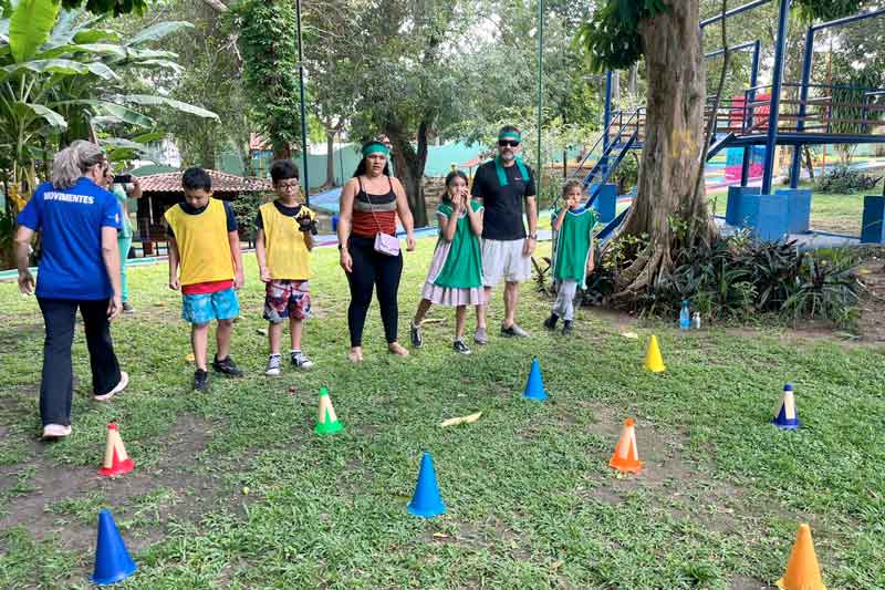 Durante o evento de encerramento, crianças e responsáveis participaram juntos de um circuito lúdico de atividades. O circuito replicou, em forma de brincadeiras, os desafios trabalhados nos polos do projeto, reforçando as habilidades desenvolvidas ao longo do ano.