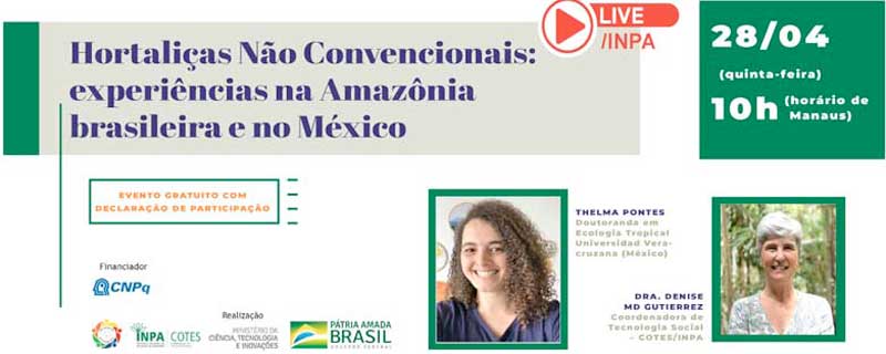 Para falar da importância das HNC’s e de sua utilização na culinária regional, a doutoranda em Ecologia Tropical na Universidad Veracruzana (México) e egressa em Ecologia do Inpa, a agrônoma Thelma Pontes, participará da Live “Hortaliças Não Convencionais: experiências na Amazônia brasileira e no México”. Os interessados podem se inscrever no endereço https://www.even3.com.br/hortalicasnaoconvencionaisamazoniabremex/ ou acessar diretamente o evento clicando aqui. Os inscritos receberão declaração de participação de 3 horas.