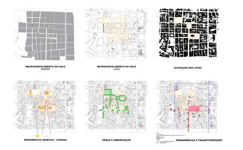 Os mapas morfológicos terão a leitura de 99 quadras, com elaboração dos mapas de macroparcelamento do solo (quarteirão); microparcelamento do solo (lotes); ocupação do lote; praça e arborização; monumentos (marcas e visadas); e permanências e transitoriedades.