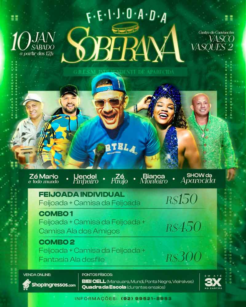 O calendário do Carnaval de Manaus ganha um dos seus capítulos mais saborosos e animados no próximo mês. A Mocidade Independente de Aparecida confirmou para o sábado, 10 de janeiro, a realização da tradicional feijoada soberana 2026. O evento terá como palco o Centro de Convenções Vasco Vasques 2, começando a partir das 12h, e promete reunir a comunidade verde e branca em uma celebração que une alta gastronomia e o melhor do samba nacional e local.