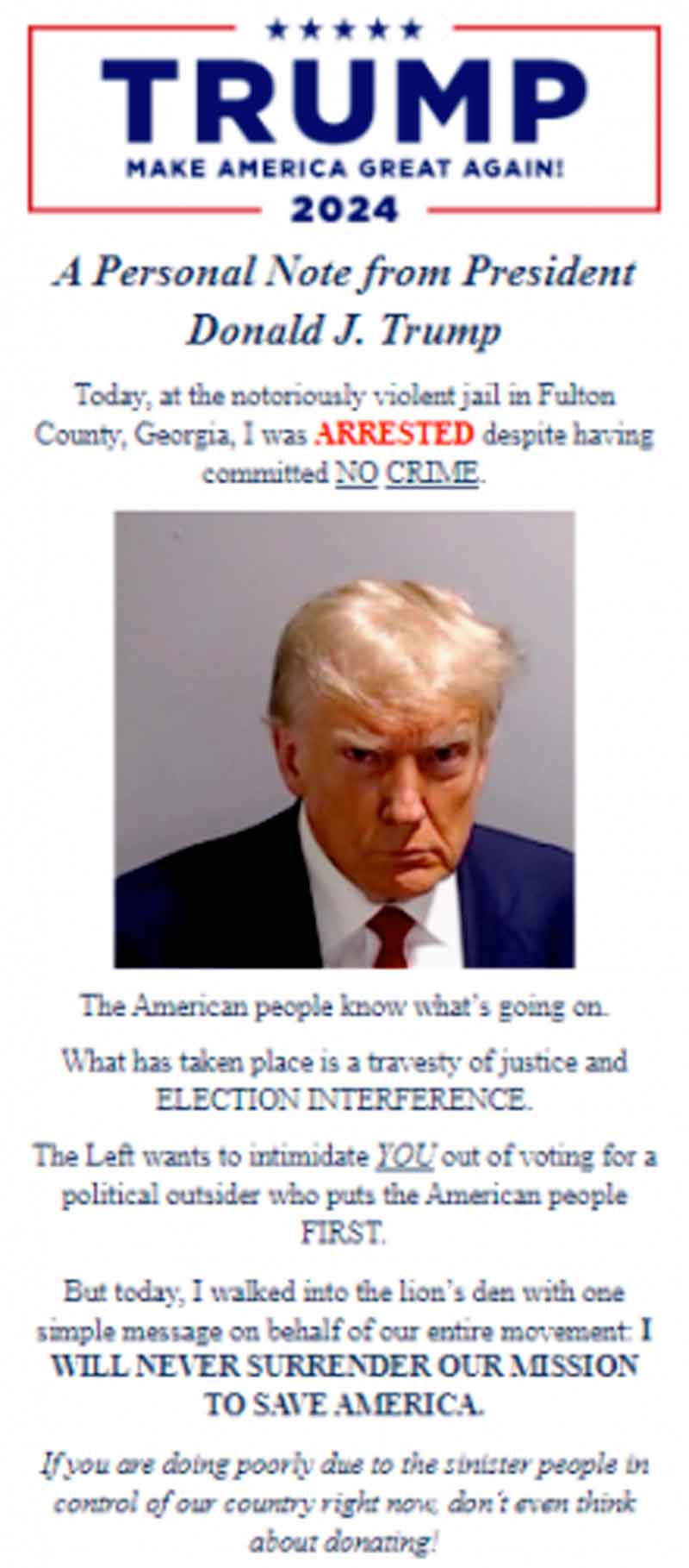 “O povo americano sabe o que está acontecendo. O que aconteceu é uma caricatura de justiça e INTERFERÊNCIA ELEITORAL. A esquerda quer intimidar VOCÊ para que não vote em um político de fora que coloca o povo americano em PRIMEIRO LUGAR. Mas hoje entrei na cova dos leões com uma mensagem simples em nome de todo o nosso movimento: NUNCA RENDEREI A NOSSA MISSÃO DE SALVAR A AMÉRICA”, diz o comunicado compartilhado em seu site. “Se você está mal por causa das pessoas sinistras que controlam nosso país neste momento, nem pense em doar! Mas se puder, por favor, faça uma contribuição para expulsar o Crooked Joe Biden da Casa Branca e SALVAR A AMÉRICA durante este capítulo sombrio da história da nossa nação”, escreveu, agradecendo aos apoiadores.