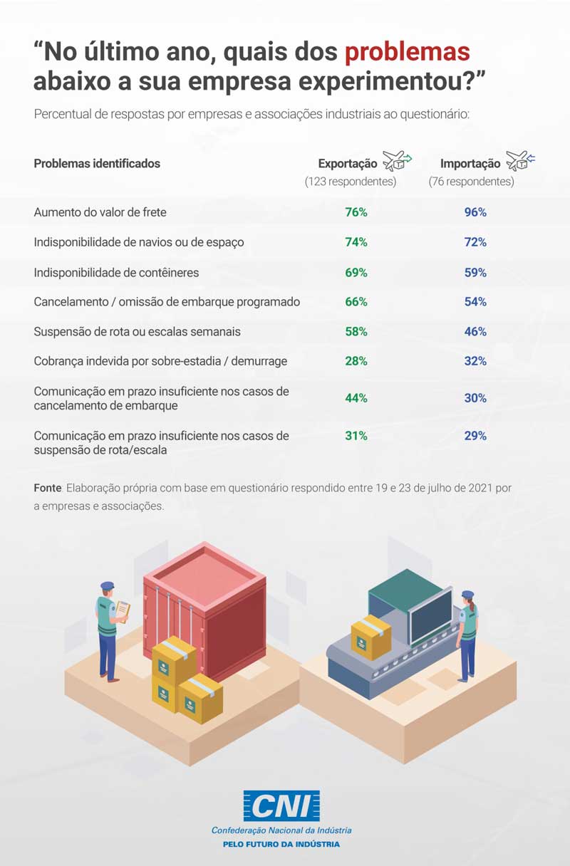 Para mapear os problemas enfrentados desde o início da pandemia, a CNI realizou, em julho de 2021, uma consulta com 128 empresas e associações industriais, em que mais de 70% relataram ter sofrido com a falta de contêineres ou de navios e mais da metade observaram o cancelamento ou a suspensão de alguma escala de programa ou serviço regular. Os dados mostram ainda que 96% observaram um aumento no valor do frete de importação e 76% nas exportações.