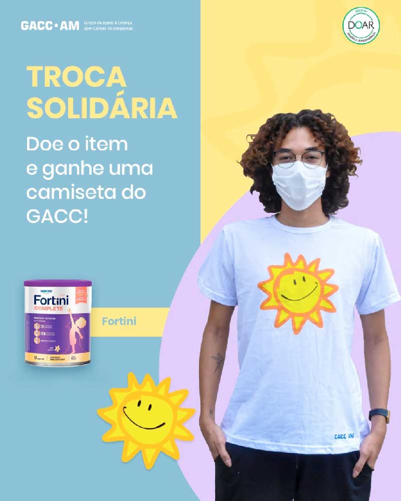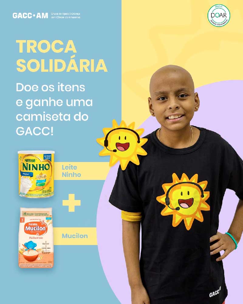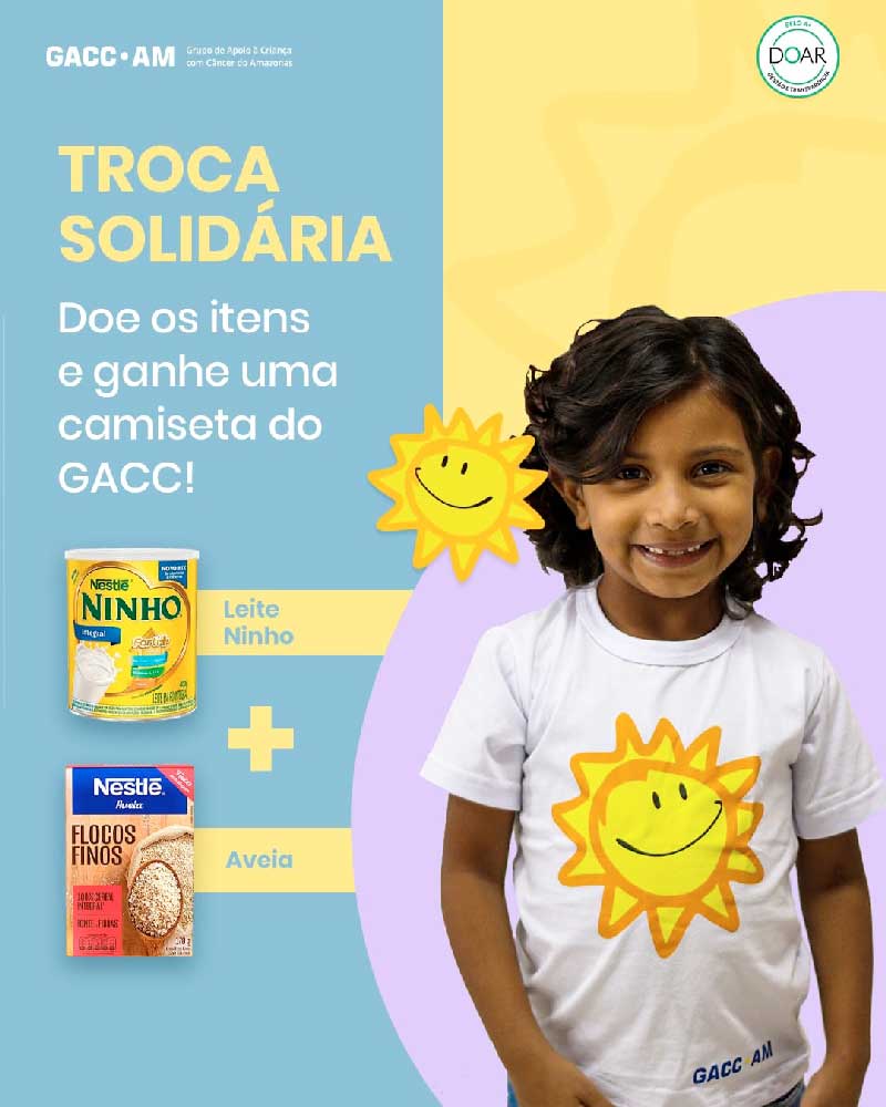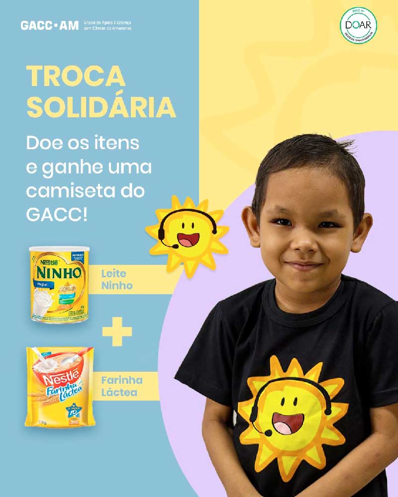 Com o objetivo de arrecadar leite e suplementos, o Grupo de Apoio à Criança com Câncer do Amazonas (GACC-AM) dá início à campanha Troca Solidária. As doações são para consumo das crianças em tratamento de câncer atendidas pela entidade.