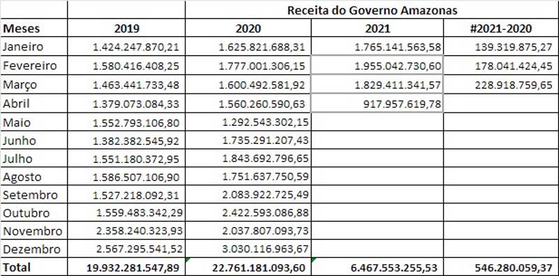 Comparando-se o primeiro trimestre de 2020 com o deste ano, o Governo do Amazonas já recebeu R$ 546.280.059,37 a mais do que o mesmo período do ano passado. Nos três primeiros meses de 2020, o total da receita foi R$ 5.003.315.576,38. No primeiro trimestre de 2021, o valor arrecadado foi de R$ 5.549.595.635,75.